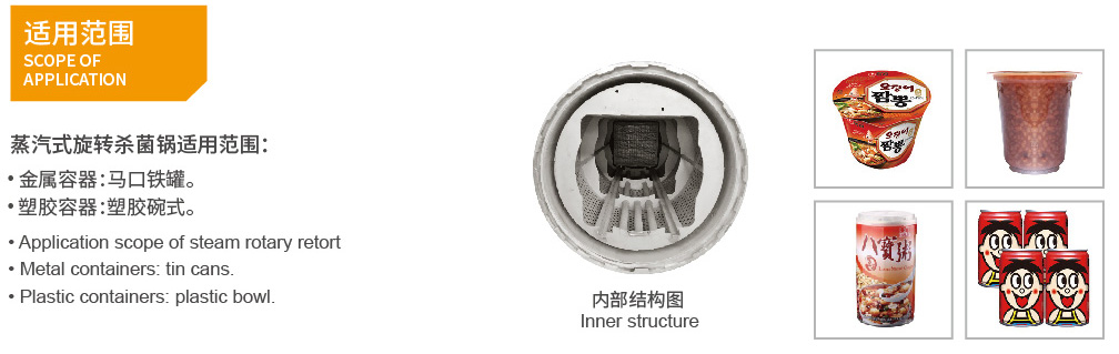 ? 特別適用于包裝物中固體比重比液體比重大,及各種濃度不同的粘性灌裝食品,使其在殺菌過程中